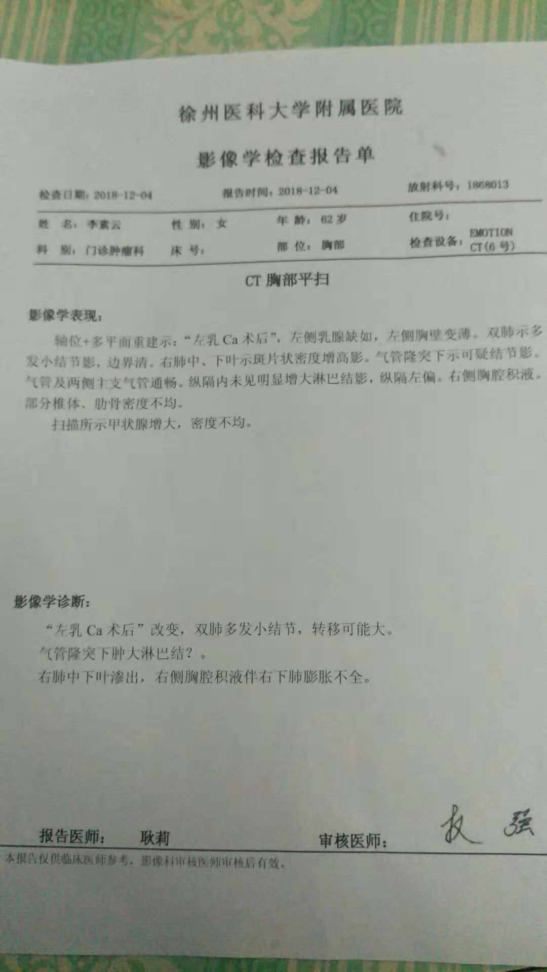 李XX,62岁,女,14年前患乳腺癌后切除治疗康复后一直每年检查都很好,近期发现10天左右感觉胸腔发热,昨天去拍片报告显示有右侧胸腔积液右下膨胀不全,双肺多发小结节。
