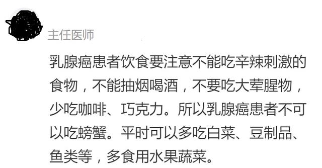 可是,自从得了乳腺癌之后,就没有再吃过了。因为她的亲戚朋友,甚至部分医生都告诉她,螃蟹是发物,乳腺癌患者不能吃。之前看病的时候,她对我的印象不错,感觉我挺博学多才,想听听我的意见。