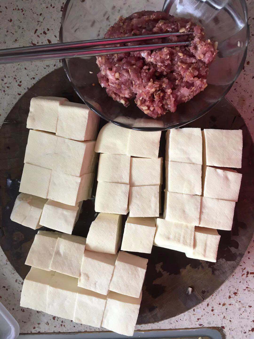 三、制作方法:1.将一块豆腐切成8小块。2.猪肉、香菇一朵、部分姜一起剁碎,加入少许盐调味拌匀备用。