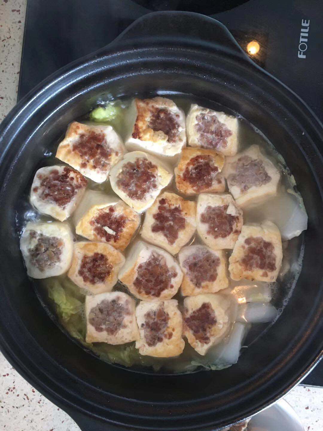 3.煎好的酿豆腐,放入用大白菜和骨汤做汤底的瓦煲内,煮沸后小火煲20分钟。好啦!大家可以品尝了,有兴趣的姐妹们可以一起来试试哦!