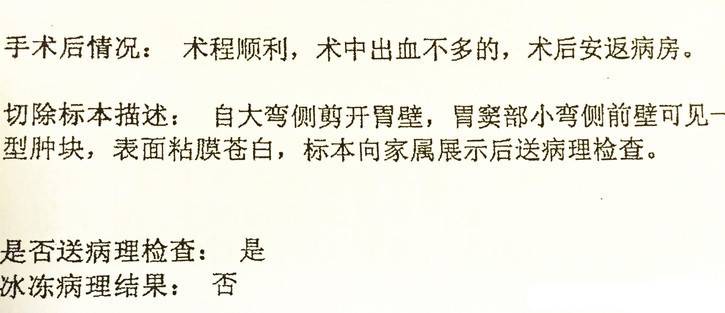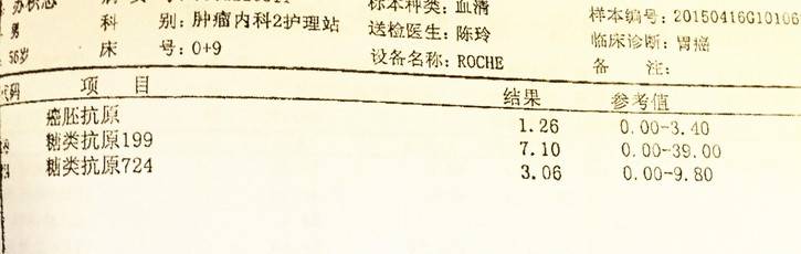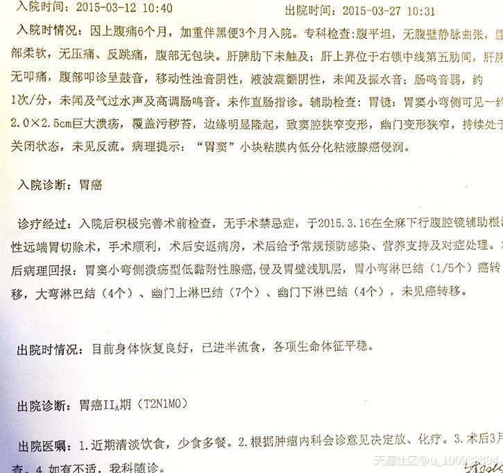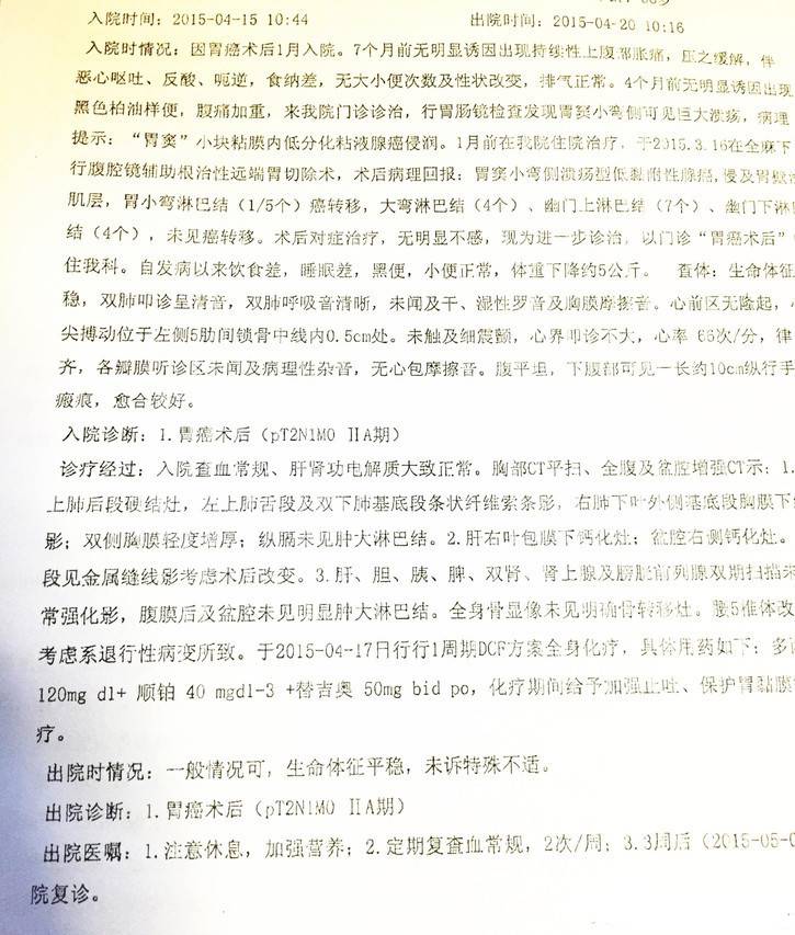 去年夏天开始偶然有恶心呕吐现象,人迅速消瘦。今年除夕晚上呕吐不止,且有黑便。2015年3月2号抵西安开始检查,腰椎4节增生,并且来西安无一点疼痛。胃部做HP螺旋杆菌呈阳性,胃造影胃部有阴影,胃镜检测出“胃窦”小块粘膜内低分化粘液腺癌浸润,隔日转肿瘤科做CT,隔日出结果未转移住院,4天后手术。手术9个小时,手术成功,切除1/3胃部以及其他组织,将近6-7两。住院15天后出院。