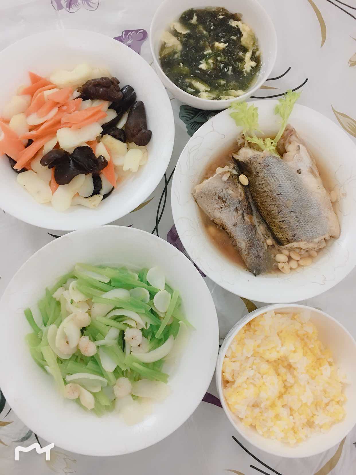 觉得挺对不起自己的,长这么大从来没有好好为自己做顿饭!自己好家人会更好!从此刻起往事不从提,余生不将就!这是今天中午的饭菜:蒸鱼(不吃鱼头,提前把鱼头去了)、油炒马蹄木耳胡萝卜、水炒西芹虾仁百合、紫菜鸡蛋汤、二米饭
