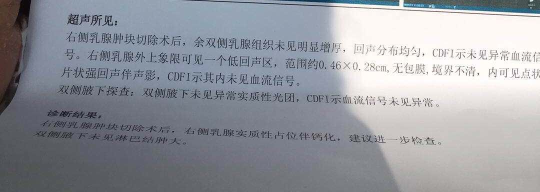 妈妈10年前就是乳腺癌,进行了手术,化疗放疗,每年都体检,今年体检的时候发现原来手术刀疤下面的位置,里面又有了,请大家帮忙看看这个彩超的结果是不是比较不好,妈妈其他检查结果都很好,这种如果确认是不好的结果,是不是就属于复发呢?