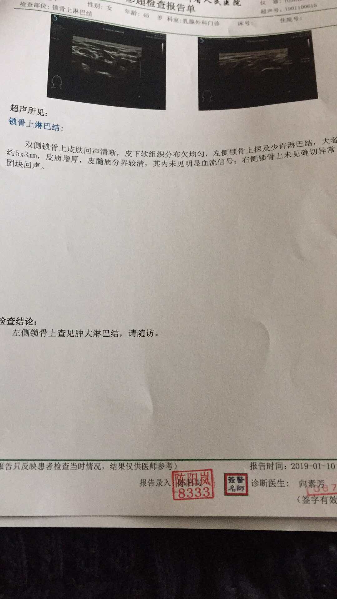 我患侧锁骨也有淋巴结,复查三次没怎么变化。医生说观察。