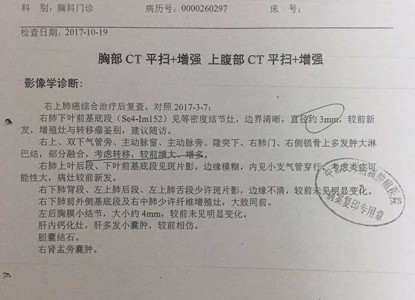 2017年10月去复查的时候龙浩教授看了CT片子很久,然后沉重的说疾病复发了。