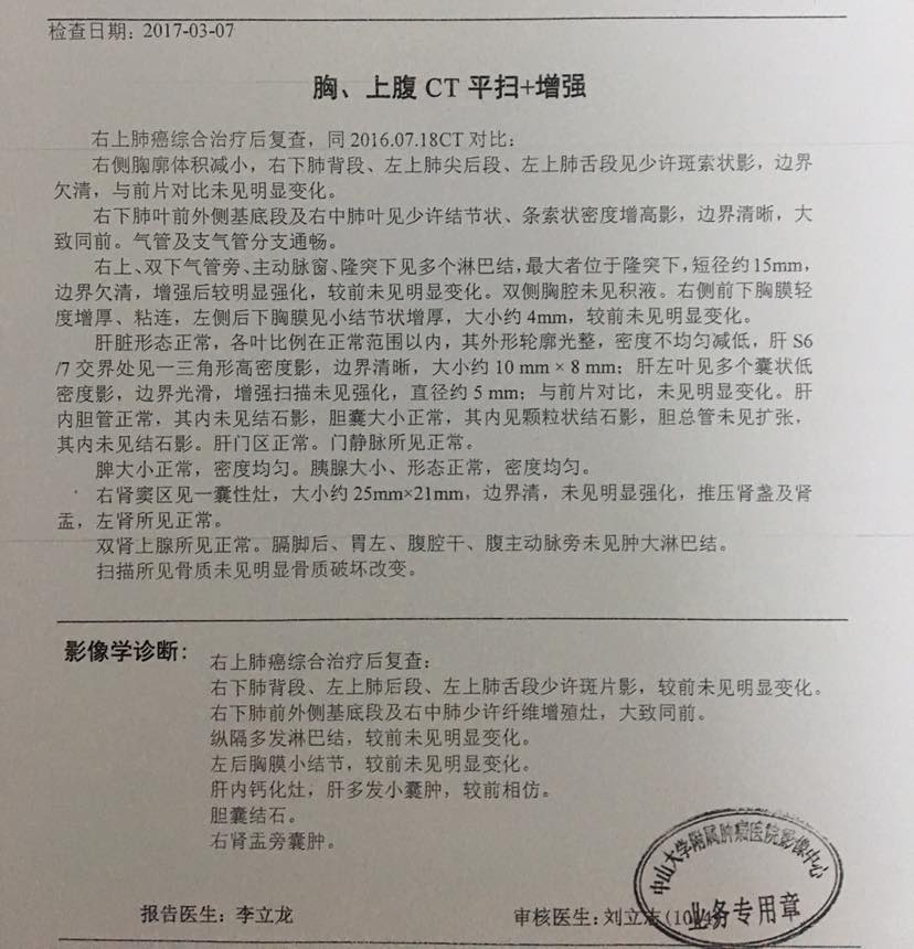 2017年3月爸爸去肿瘤医院复查结果还是跟原来一样,跟龙浩教授约定半年后再来复查。