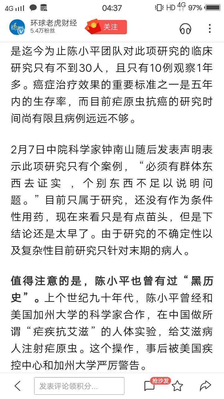 我看了视频,我没听出来说疟原虫现在可以治愈,我觉得他们公布这个无论是从哪方面,都没什么问题。原理是现在都在努力的方向,这个不用质疑。不公布,不会有患者关注,不会有人入组。不真正用于治疗,谁也不知道效果怎么样。对于已经没办法的患者,这就是一丝希望,不存在伦理道德!个人看法!不知道看衰这件事的人,是怎么想的!