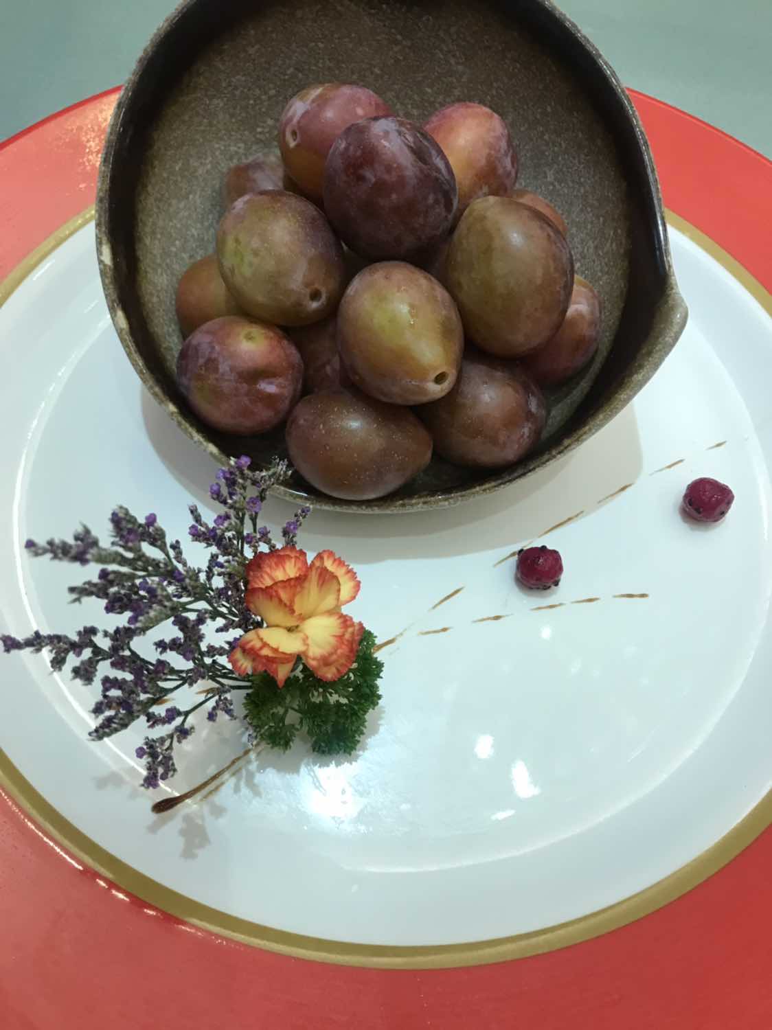 我没抵挡住诱惑,这个菜品是一个白色巧克力圆球,再用黑巧克力酱浇上,打开圆球,里面是好吃到爆的冰激凌,对了,这个菜品叫做夜明珠。