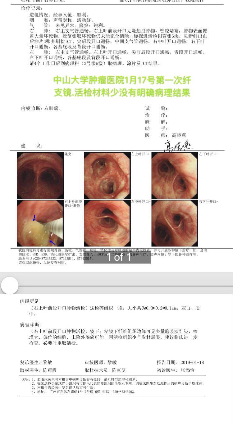患者是我爸今年65岁右肺占位,是老烟民有肺气肿肺不张,因为支气管有肿物堵塞最后做了穿刺希望能确诊,一月在第一次纤支镜后没经验没处理好触发堵塞性肺炎整个二月在门诊住院治疗肺炎。为了确诊一共做了两次纤支镜(两次材料太少无法定性和做基因检测)和最近三月中做了一次穿刺活检,目前在等穿刺的基因结果,因为在两家医院做的病理结果和免疫组化有明显不一样意见,想请教一下医生和觅友们的经验分享和建议。