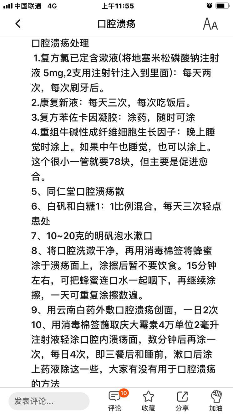 10、用消毒棉签蘸取庆大霉素4万单位2毫升注射液轻涂口腔内溃疡面,数分钟后再涂一次,每日4次,即三餐后和睡前,漱口后涂上药液除这一些,大家有没有用于口腔溃疡的方法
