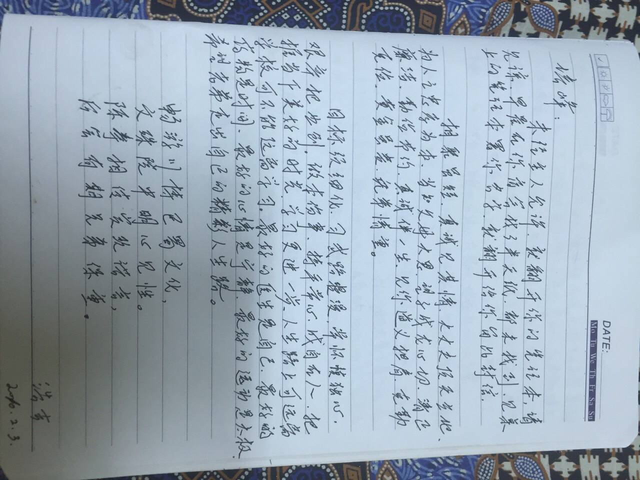 刚收拾行李时,翻出了大学时候的记事本,打开后看到2010年2月3号李浩吉哥哥给我留的信。当时他来四川游玩,我接待他。我俩只因太极拳在网上相识,他说想来四川,我说好,他便就来了。那次之后虽身在两地,却常相互诉说各自近况,中间也有几次会面,虽淡泊但义重。 而短短四年多时间,已是斗转星移,哥哥今年五月因癌去世,我现在准备回国检查身体。可叹啊,这世间的事情,总是变幻莫测,让人措不及防。试问一个人的能量能有多少呢,能够左右的了什么,我们每个人都太渺小,面对很多事情也无能为力。这一切都会改变,这一切都会消失,我们也会。但我以为有些却是永恒的,它不会随着时间的流逝,岁月的长河,时代的变迁而消失,它是情谊与品德。像哥哥留给我的信写的一样【虽短,真诚见其情,大丈夫顶天立地,为人之忠孝为本,当知父母大恩,望子成龙心切,清正廉洁、勤劳节约真诚伴一生。见你道义担肩,克勤克俭,黄金虽贵,兄弟情重】