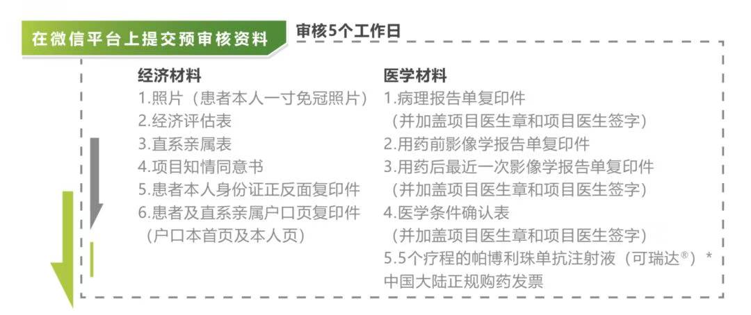 患者自行使用5个疗程的帕博利珠单抗注射液(可瑞达®),经基金会审核通过后,可为其援助5个疗程。后续患者每自行使用3个疗程的帕博利珠单抗注射液(可瑞达®),基金会可继续为其援助3个疗程。患者累计使用帕博利珠单抗注射液(可瑞达®)用量最多不超过24个月。