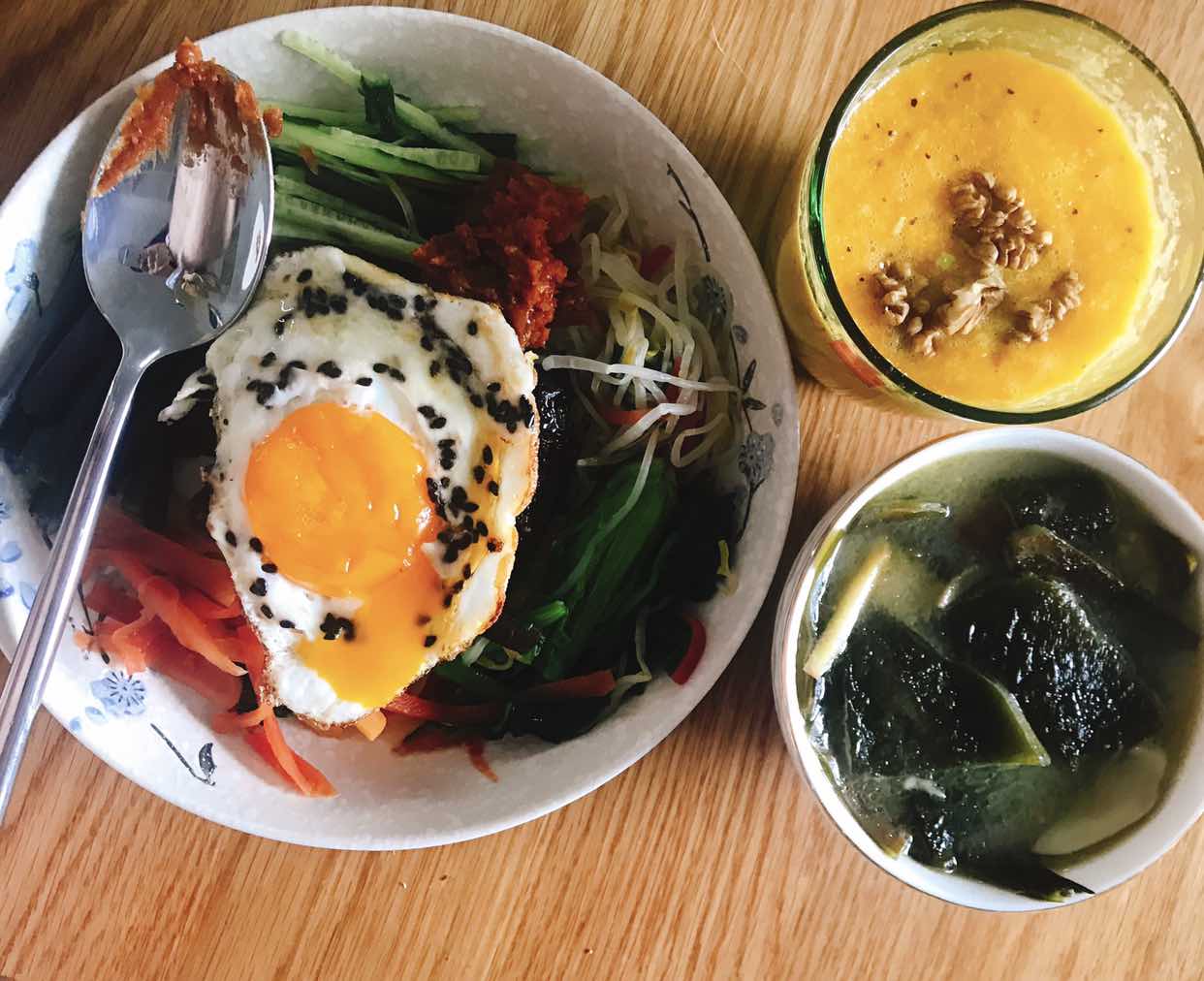 韩国拌饭(野生蕨菜 菠菜 豆芽 胡萝卜 黄瓜)紫米花生米饭 煎鸡蛋