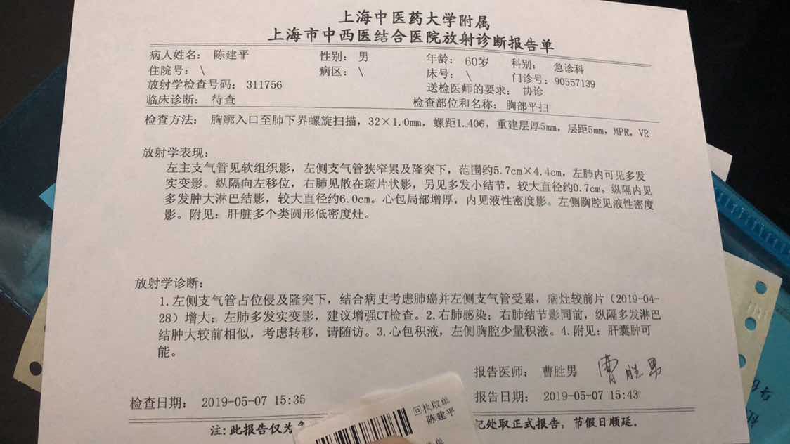 爸爸重度肺部感染 先消炎症吧 可是肿瘤又大了 发展得太快了 还好爸爸的胃口还是不错的 能吃  只希望爸爸能够好好的