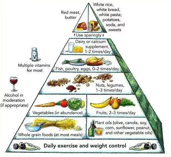 地中海饮食就像一个金字塔,塔底是大量的运动,然后是蔬菜、水果、全谷物、豆类、坚果、橄榄油,再往上是鱼、海鲜、禽类、蛋、乳制品,最上面需要限制的是甜食和红肉。