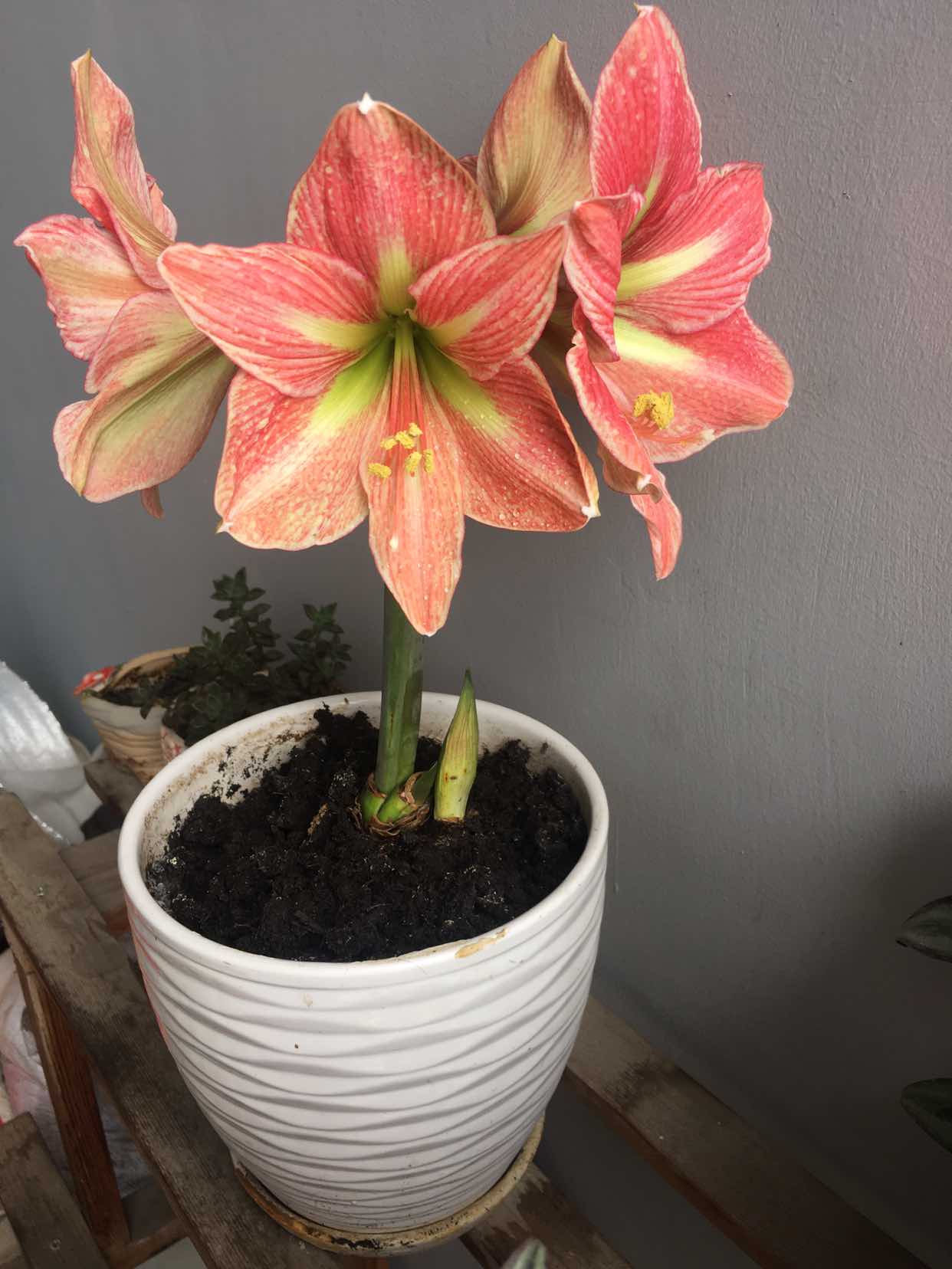 看见别人家的朱顶红开的好漂亮,网购的花球,已经过季只有一个品种了,收到后埋在花钵一个月,每天早上起来就去看看长大一点没有,终于开花了,一个花苞直接长出花箭然后裂开有四朵花,挺好看的,还有重瓣的品种更加漂亮,秋季准备再入。