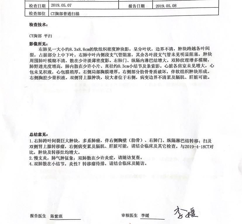 妈妈患肺癌已经有三年了,这三年来一直在接受治疗到现在,下面是妈妈检查以及治疗的过程。2010年10月,妈妈体检出肺癌IV期,纵隔淋巴转移,肝部转移,去省肿瘤医院复查,做了PET-CT,结果一样,省肿瘤