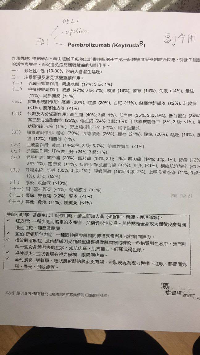 老公听完建议后回来宾馆马上和我商量,并把医生说的话告诉了我,我内心还是很想先上pd1再做化疗的,并叫老公第二天去问问主任的看法,因为是礼拜天,主任要礼拜一上班,然后打了一个电话,把检查结果告诉了我爸爸,爸爸听见没有靶向药吃,突然一下没有说话,我知道他很失望,而且他也知道没有药吃,没有手术做,意味着剩下的办法越来越少了,我老公叫他不要担心,还有免疫可以打,并且安慰他说免疫治疗有效果的话和靶向药一样。爸爸一听说好的,如果能尽快打就更好。