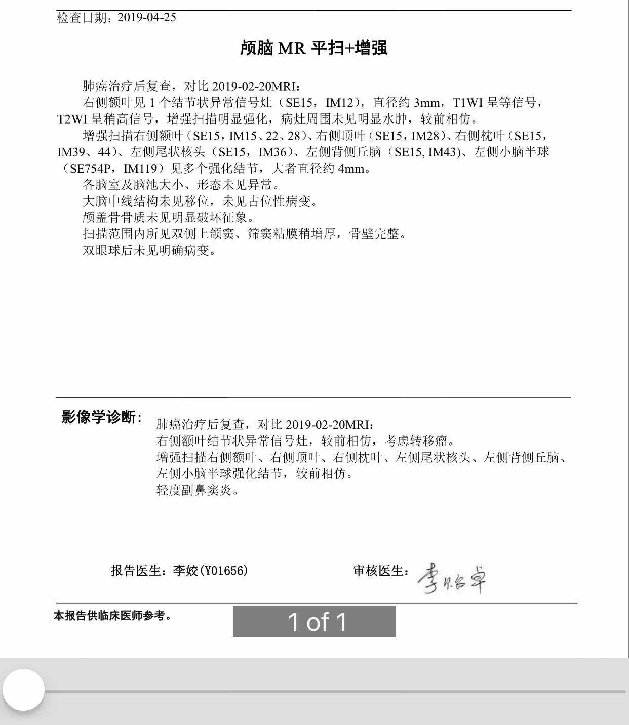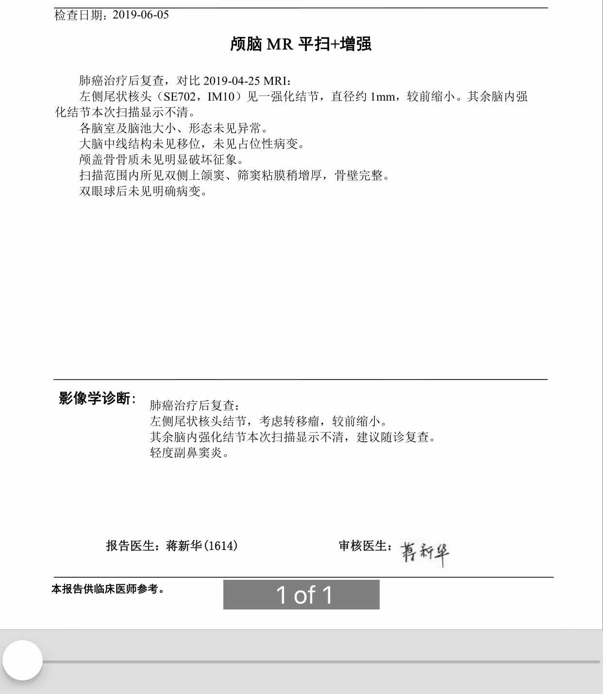 吃9291一个月医生让复查,医生从片子上看说看不见了🙈(我当时听不清还说是差不多吗?😂),晚上这会终于看到了医院的报告,但是上面的表述是本次扫描显示不清,建议随诊复查?