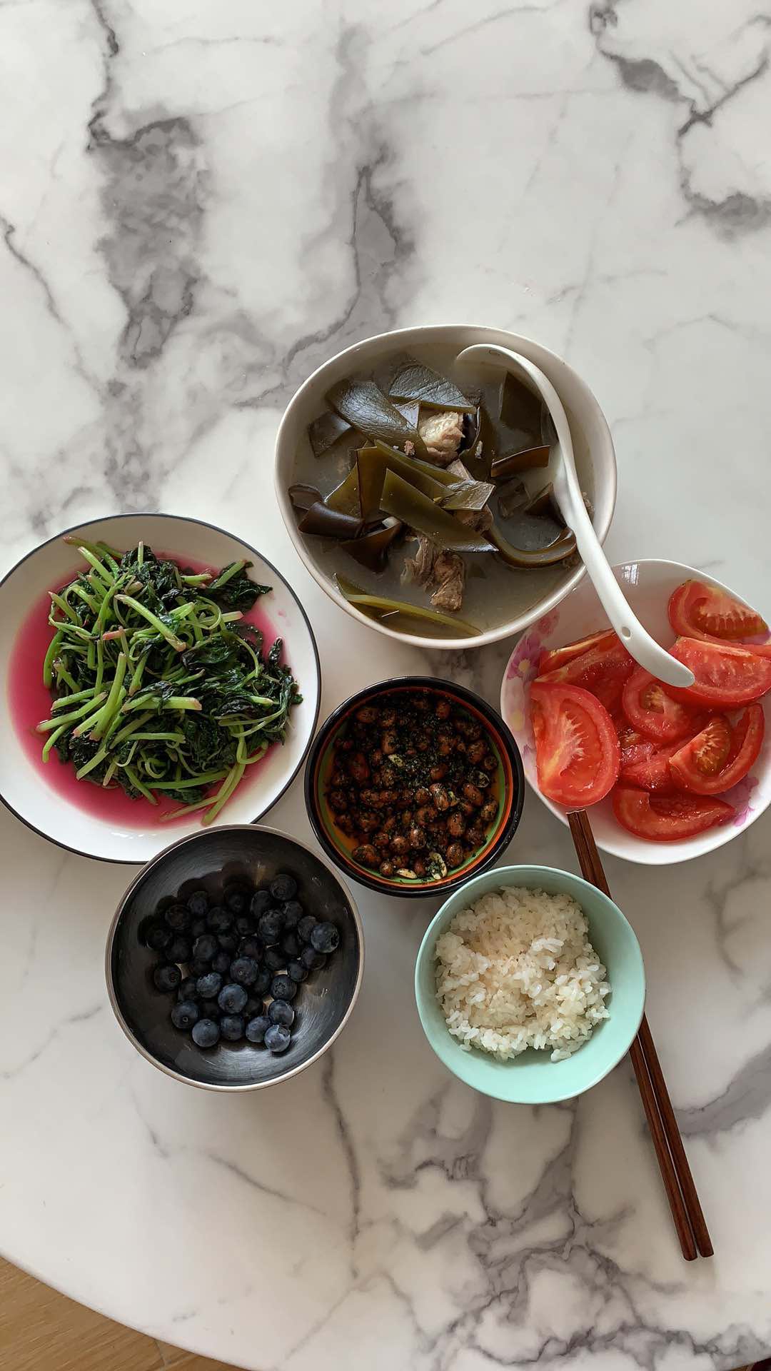 前面四疗难受得没一点力气,除了想办法吃,就是晕晕的睡,到第五疗已经胖了十斤了,换药水后胃口没那么难受了,也渐渐有点力气了,换了个轻点的锅,做做饭,这是中午自己吃的饭,简单一点,还是喜欢清淡饮食