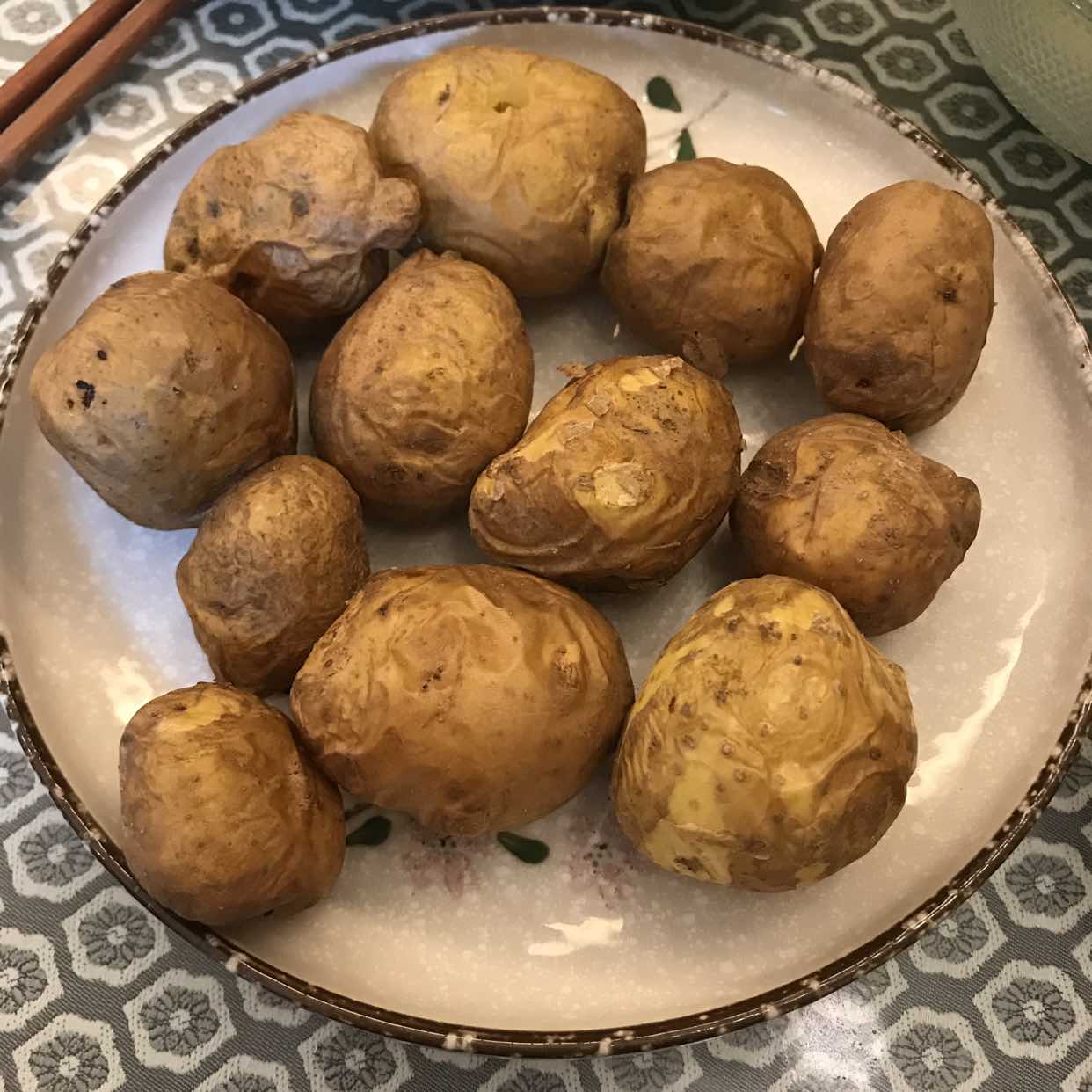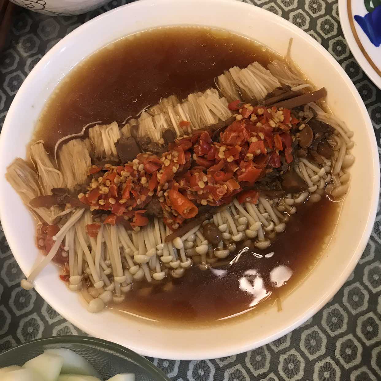 连续两晚,熬酱,分了些给朋友。。今晚,饭都懒得做了,把小土豆洗干净丢空气炸锅,当主食。给他做了点粥,煮了酸菜饺子。金针菇洗了撕几条,昨晚熬的酱淋点上去,再放点剁辣椒,上锅蒸熟。