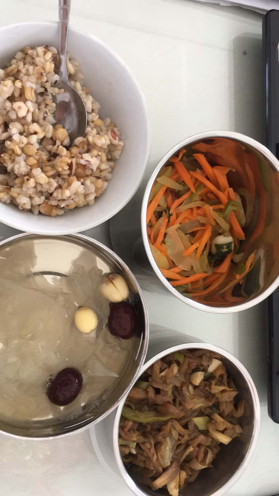 十一谷米饭,银耳红枣莲子汤,青椒炒茄子丝,莴笋炒胡萝卜丝