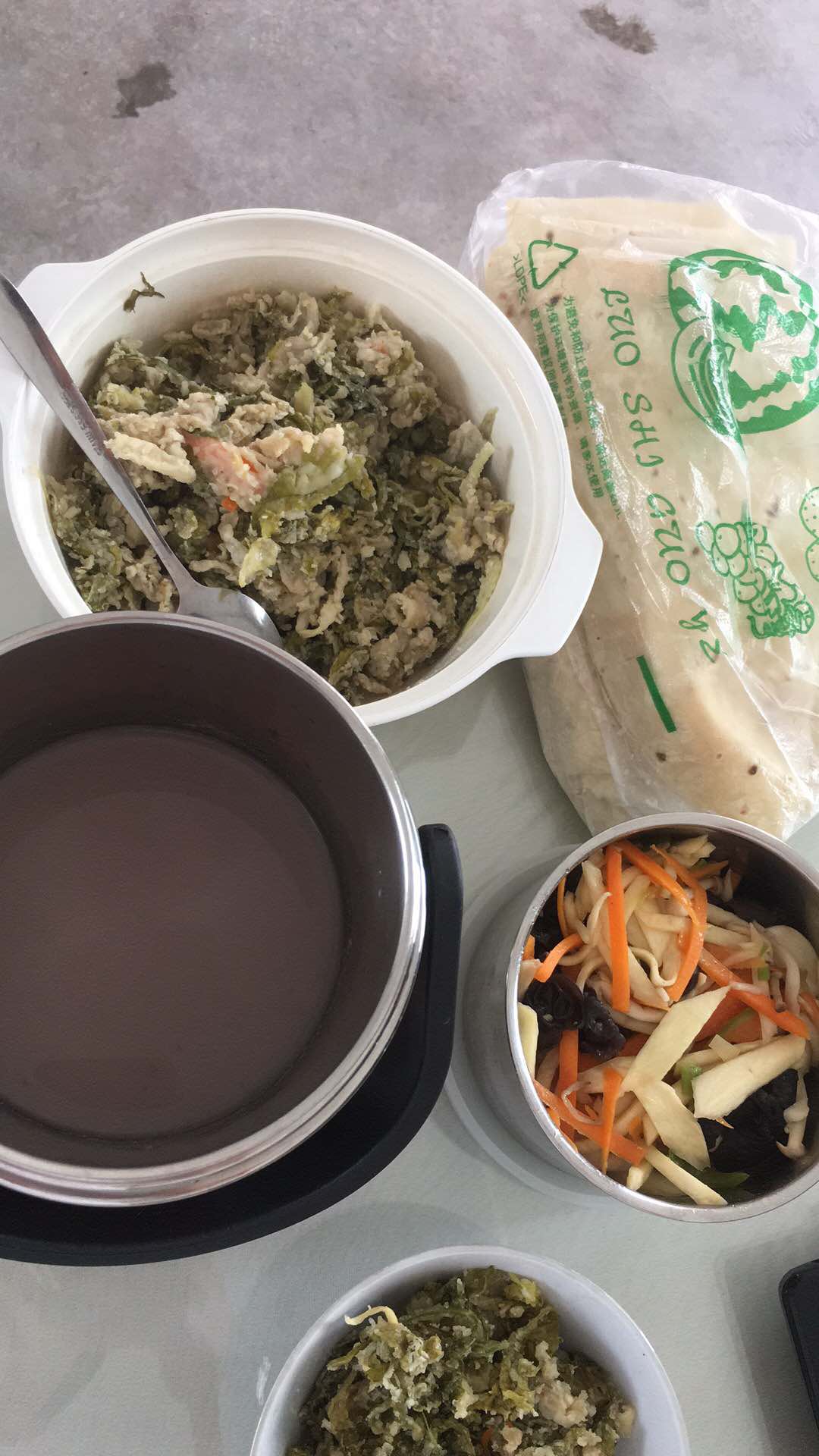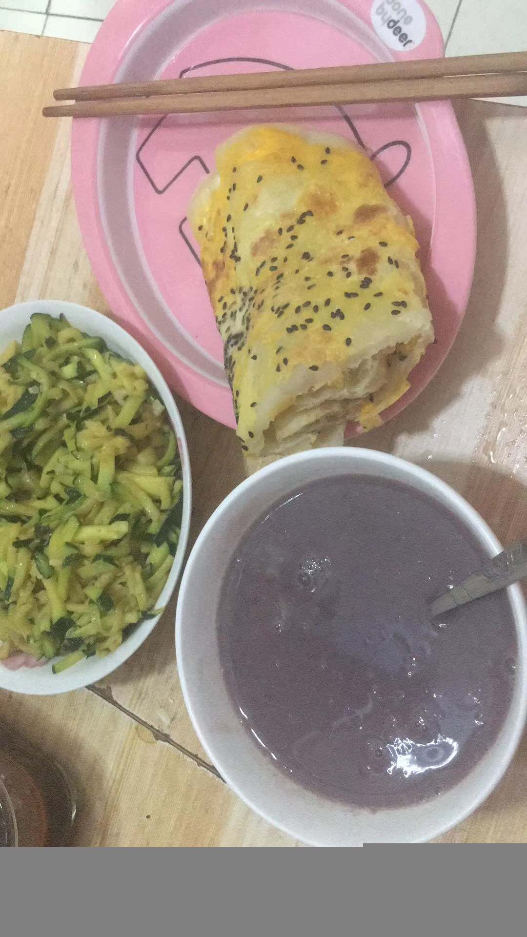 早饭,五谷豆浆,鸡蛋饼,南瓜丝