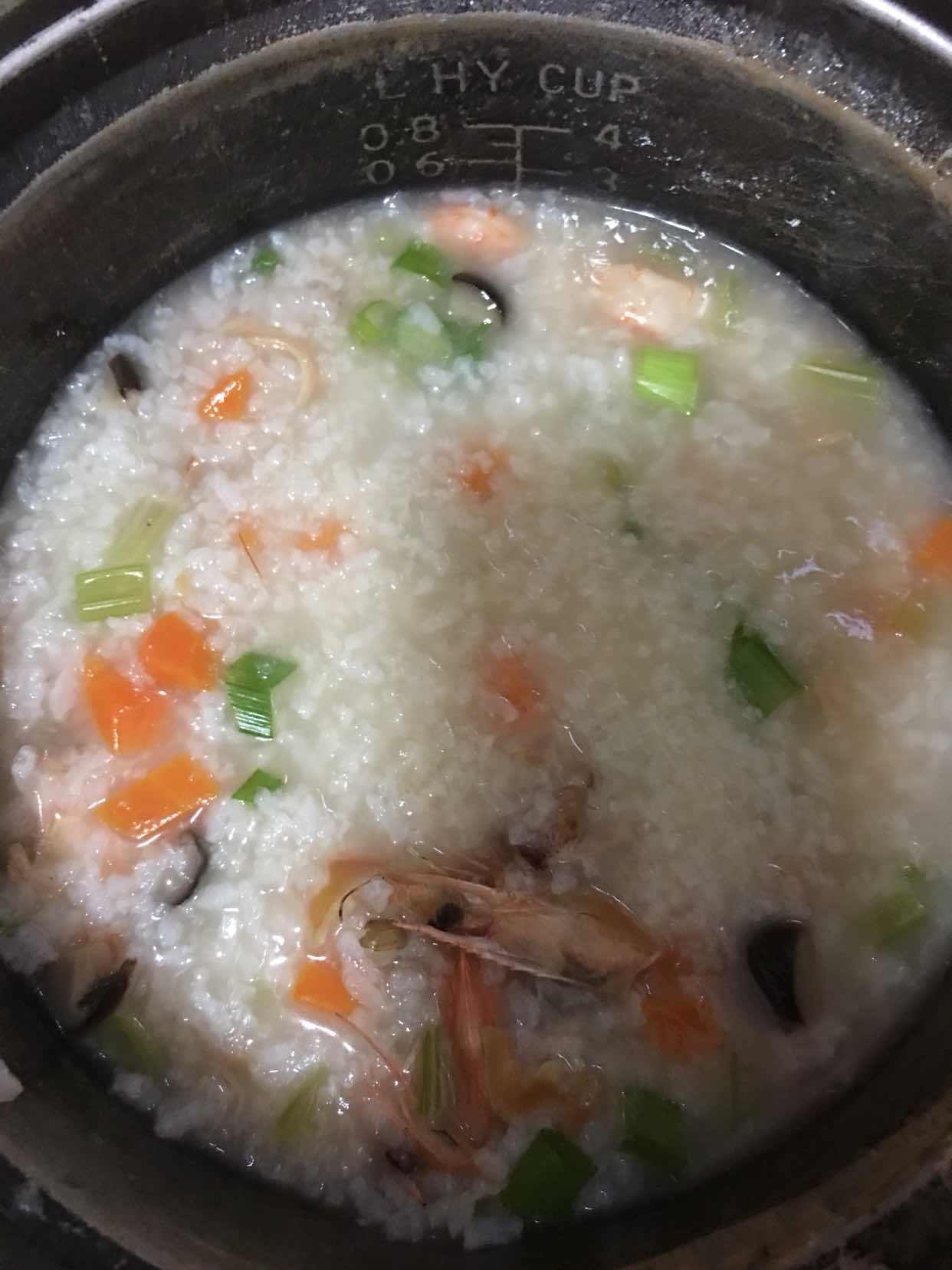 海鲜粥,里面有芹菜丁,胡萝卜丁,香菇丁,鱿鱼丝,鲜虾。虾洗净后开背去虾线,吃的时候很方便。