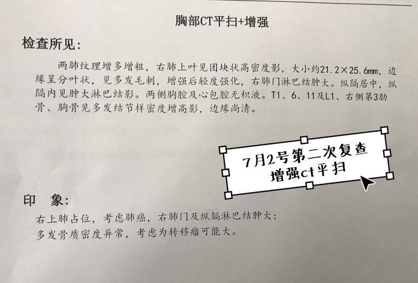 7月2号第二次复查结果:CEA:26.54(于上次复查下降0.56),肺功能数值全部超标,增强ct平扫结果肿瘤大小:2.12x2.56cm(于上次复查相差不大),右肺及纵隔淋巴结依旧肿大,T1、6、11及L1、右侧第3肋骨、胸骨见多发结节密度增高影。
