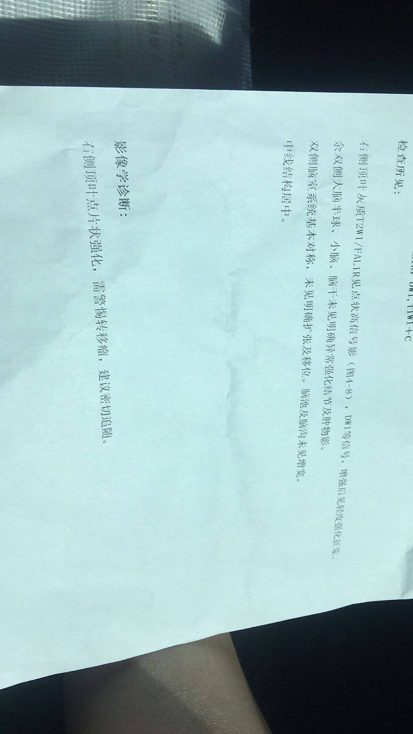 今天本来打算预约放疗科看看需不需要放疗的,之前把各种检查又走了一遍。结果老天又跟我开了一个大大的玩笑,当拿到脑核磁报告的一瞬间,当看到警惕转移几个字的时候,我这心脏啊都快跳出来了,手不听使唤的哆嗦。医生说我妈的情况有些复杂,先不做任何治疗,一个月后再做一个脑核磁,再定治疗方案。这真是不给人喘气的机会呀!