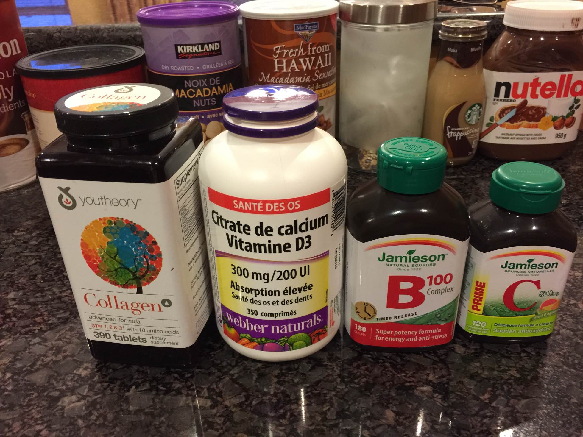 从左到右:胶原蛋白及18种氨基酸,增加活动关节的韧度,有利皮肤,头发,骨胳的健康;带维他命D3的柠檬酸钙,防止股坏,骨质疏松;维生素B族:针对反应神经系统;维生素C(带有叶黄素Lutein),增加眼睛的抗氧化能力,防止因为吃羟氯奎的激素引起的眼底黄斑病变及早期白内障。