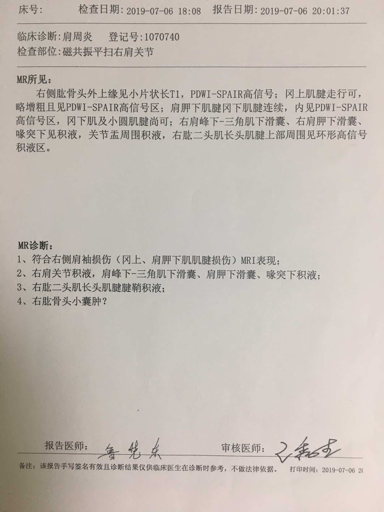 从年初就开始右肩后展疼,其它动作不疼,四月复查看了一下关节科,让拍核磁。拖到7月6日才去拍,结果显示肩袖损伤。这阶段疼的明显加重,叉腰或是后展都疼的厉害,连右侧卧睡觉也会疼,一直牵连到上小臂。7月18复查,顺便在上级两个医院分别看了骨关节科和运动医学科 ,一个诊断为肩袖损伤,肩峰撞击症,建议手术。另一个说暂时还未达到手术标准,但是也不能自愈,严重后也是要手术。好无奈,狼确诊两年多,又冒出这个病,真是雪上加霜。心里也好害怕,手术听着都疼,好好的肩袖怎么就坏了,也没受外伤,到现在找不到原因。