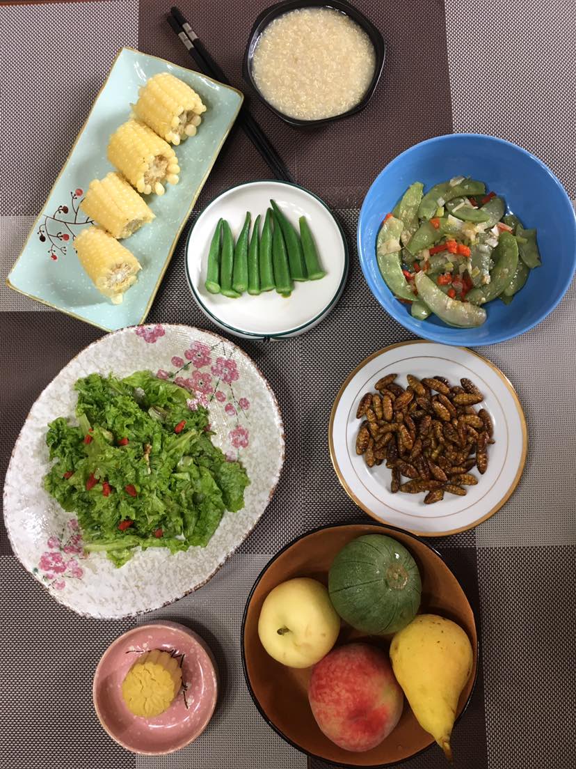 早餐:藜麦粥/蚕蛹/无糖DIY绿豆糕/醋拌生菜/凉拌豆角/水煮秋葵/果盘