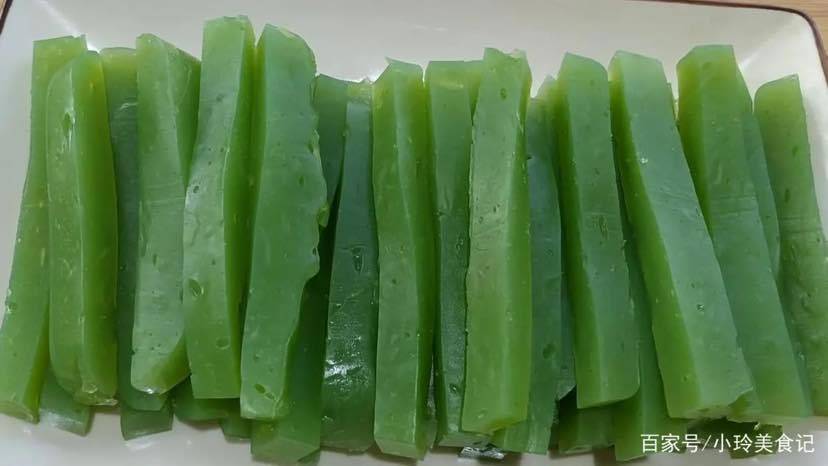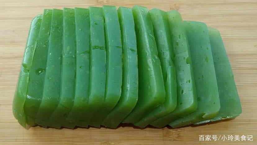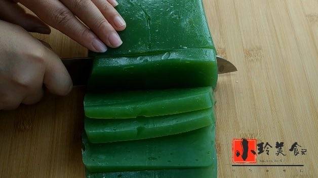 7.时间到把凉粉从冰箱里取出来,用刀切成片,再切成条。