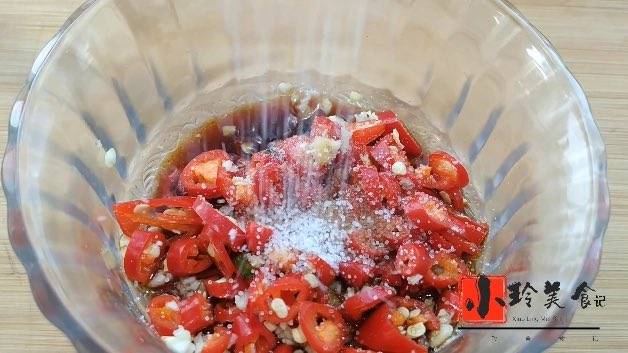 6.自然晾凉,凉了以后放到冰箱里冷藏1个小时备用,我准备料汁,把大蒜切碎,小米辣切碎倒入碗里,再加入3勺味极鲜,适量的盐,1勺辣椒油,不喜欢吃辣的也可以不放搅均匀备用。