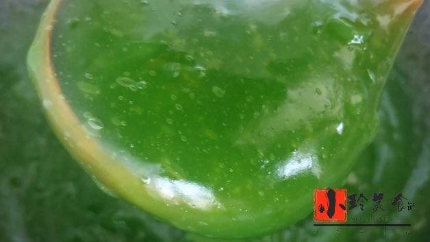 5.把熬好的黄瓜汁倒入模具里,再震几下,震出里面的气泡,表面用勺子涂抹平整。