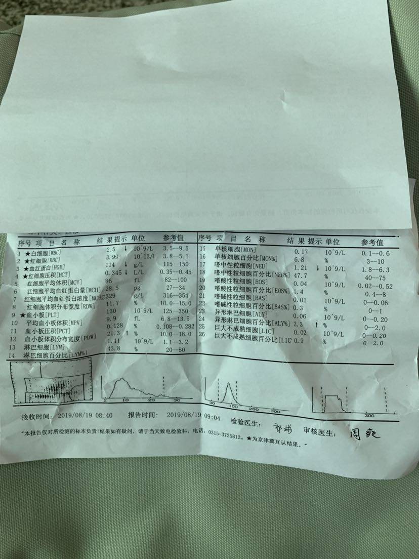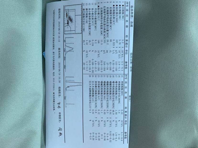 8月19日早上做的化验,好像每次早上白细胞都比下午低。下午我又去指尖采血做的血常规,白细胞有所上升,但是血红蛋白低了。因为最近妇科的原因,贫血了。