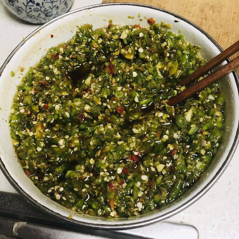 趁上班前,把辣椒,姜蒜都用绞肉机绞了。拌上各种调料,菜籽油一浇。。唉呀妈呀,真香。。。后悔早餐吃早了,馒头夹这个应该更好吃。。