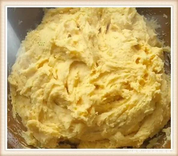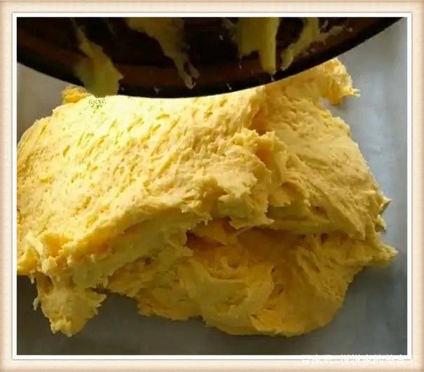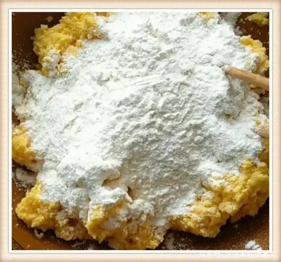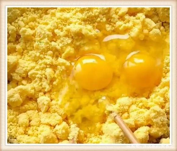 【第一步】:首先碗大碗里面倒入玉米面300克,这里用的是细玉米面,然后刚离锅的开水300毫升来和面,边倒边搅拌把玉米面烫一下,因为玉米面是没有黏性的,我们要用开水给它烫一烫,让它能够更加容易抱团粘合在一起,搅成面絮状后打入2个鸡蛋,这样子能够使玉米发糕的营养更加丰富,