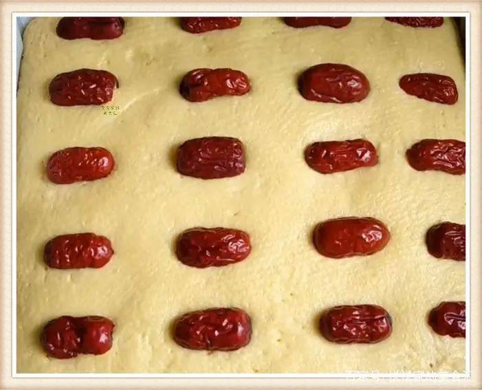 【第四步】:趁这个时间我们把红枣洗干净,剖开去核,二次醒好之后,把切好的红枣摆在上面,在这里一定要注意一定不要让它二次醒发过头,如果醒发时间太久的话,面筋就会支撑不住导致塌陷变形了,严重时还会有酸味产生。