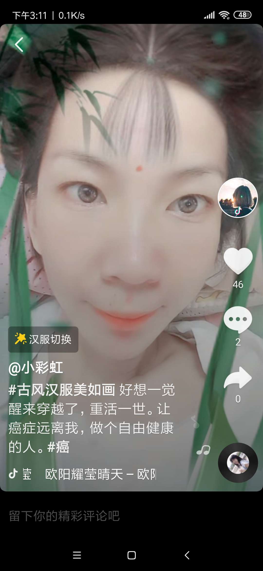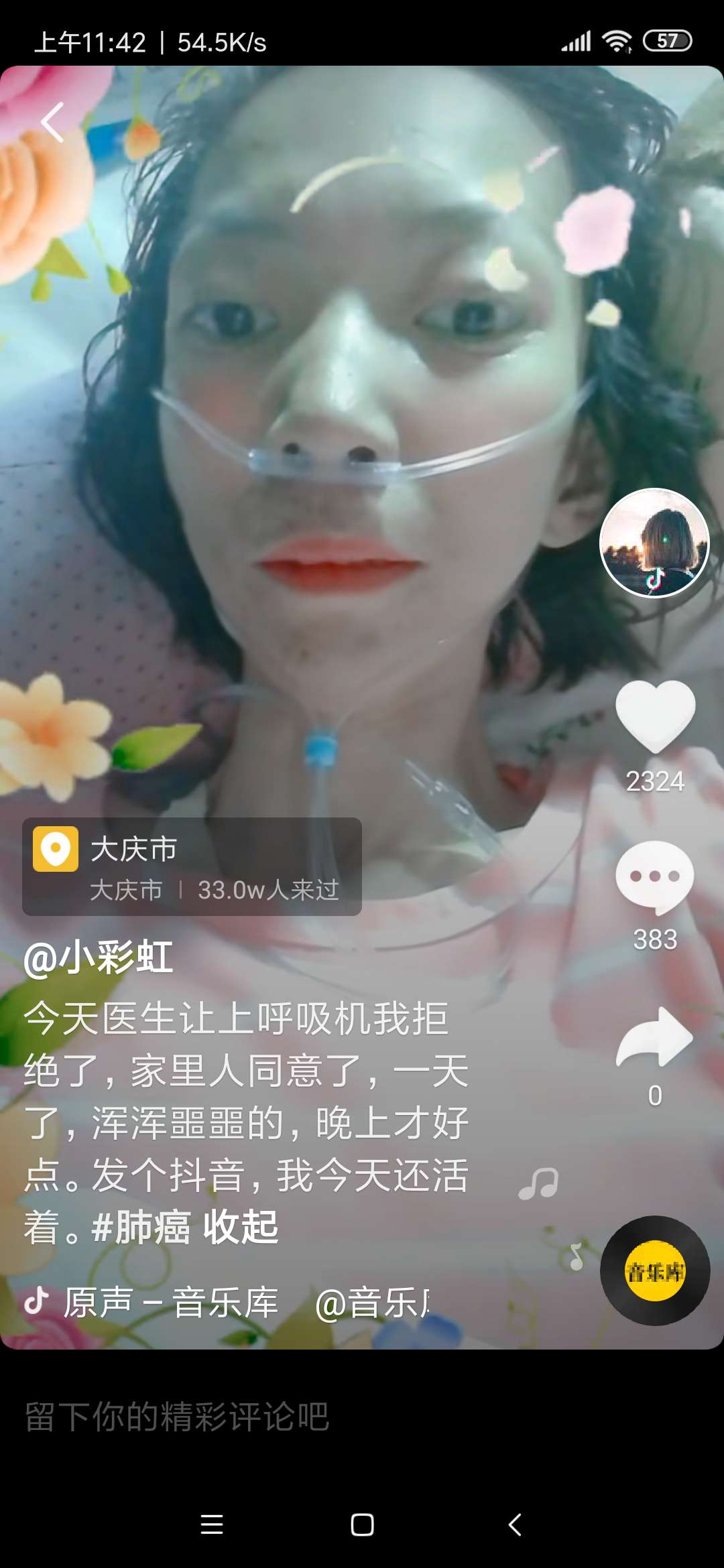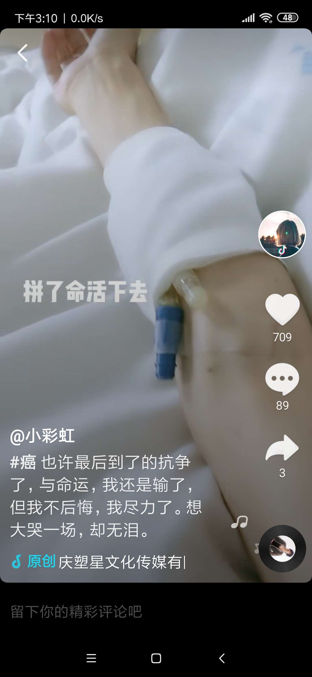坚强的孩子,美丽的姑娘,我一直在关注你,得知你病逝的消息,这几天我一直在抖音里寻找你,多么希望在听到你的声音,天堂没有痛苦,没有疾病,孩子一路走好。。。