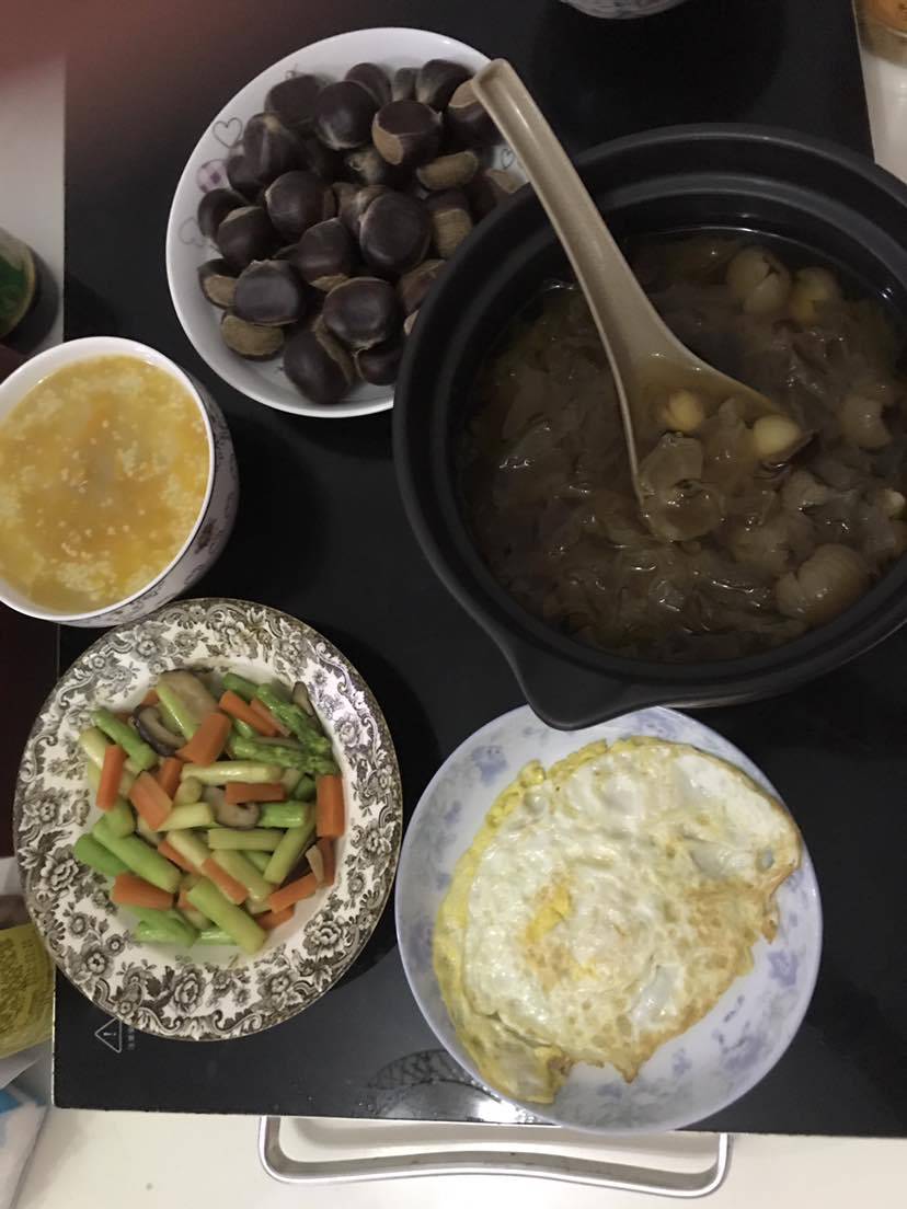 睡眠不是很好的我,昨晚睡得还不错!早上六点多起床,熬上南瓜小米粥;炖好莲子、红枣、桂圆、木耳汤;准备炒个青菜,吃个茶油煎蛋;早餐算是完成啦!顺便炖上野生金线莲汤,再吃点水果🥭