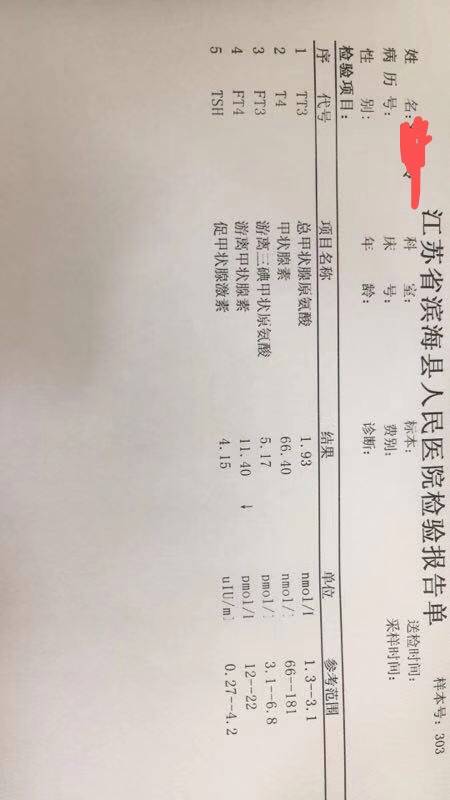 我手术近一年了,现在在打赫塞汀,自从服内分泌药阿拉曲唑,就好像缺钙,脚后跟疼,后来吃钙片缓解,现在每天睡觉起来手指感觉肿胀,做了B超,医生说甲状腺偏小,抽血化验报告请大家看看是否是甲减?