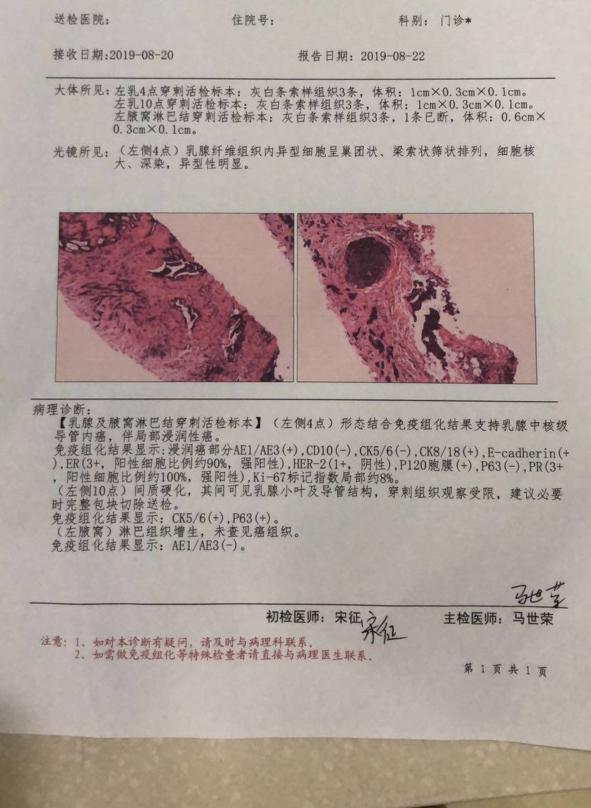 穿刺免疫组化的结果出来后,医生说我的指标符合他们医院的临床实验组,问我愿不愿意加入 ,当时有点蒙圈,说了一堆,我也没问有几个人加入的,也没听懂什么,就听懂一句话,可以免一次化疗的费用。我和老公毫不犹豫的就答应了😂我用的是新辅助化疗,就是先化疗,后手术,因为肿块比较大,看有没有保乳的希望。14天一个疗程。下面是我化疗的药和免疫组化结果,有没有和我用一样的药,这个用完每次身上都很疼😭