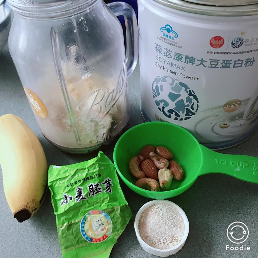 今天老妈依然想“喝”早餐,而且说不能多!好吧~黑麦片、小麦胚芽和香蕉打底,加一勺蛋白粉,加几粒坚果,多维和钙镁片碾碎也加进去… 从碳水、优质蛋白、优质脂肪到各种维生素矿物质基本齐全了!液体食物相对进食量要多些,看着老妈把那一小碗“糊糊”全喝掉,我就安心啦~👍🌹💪