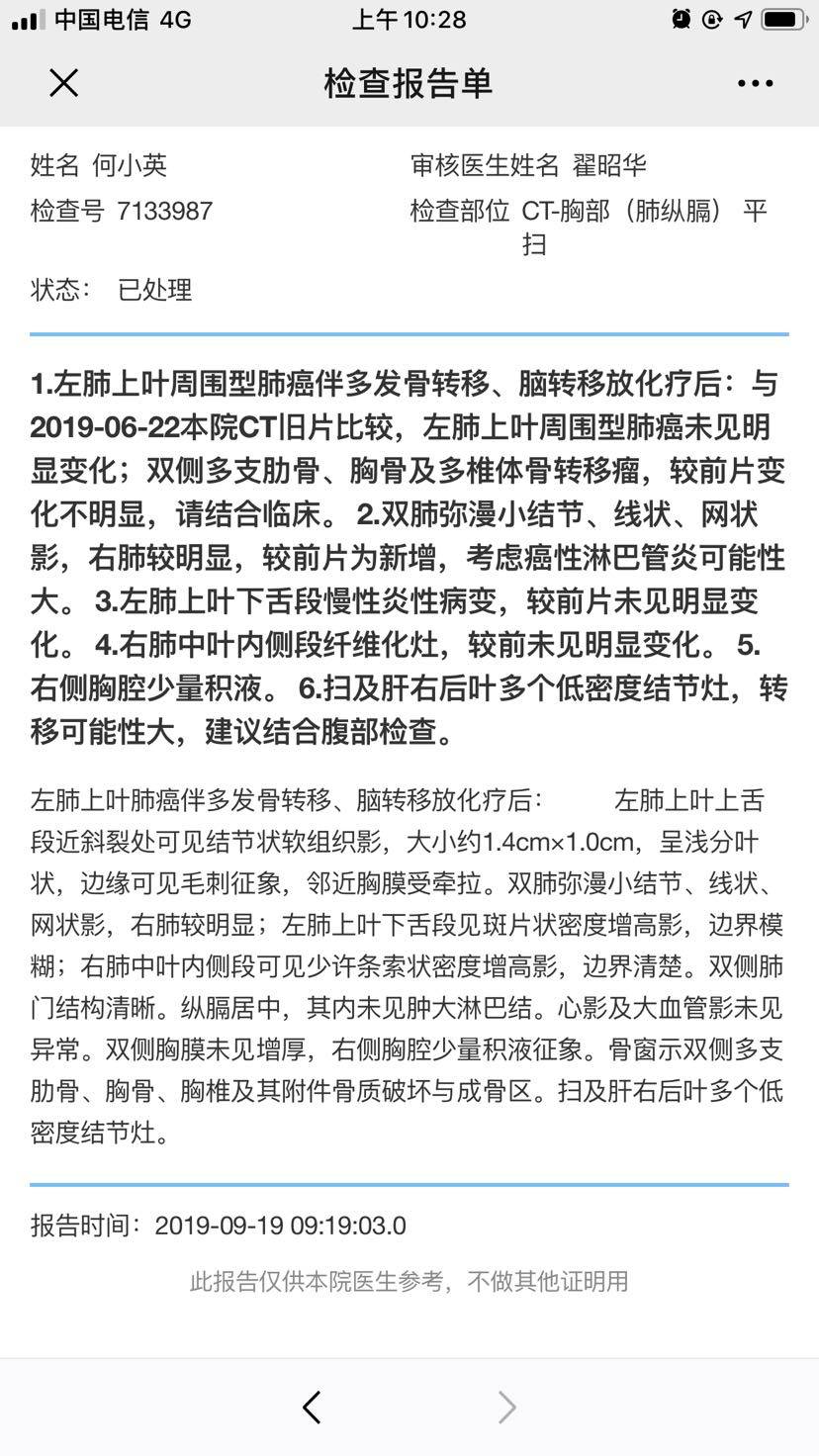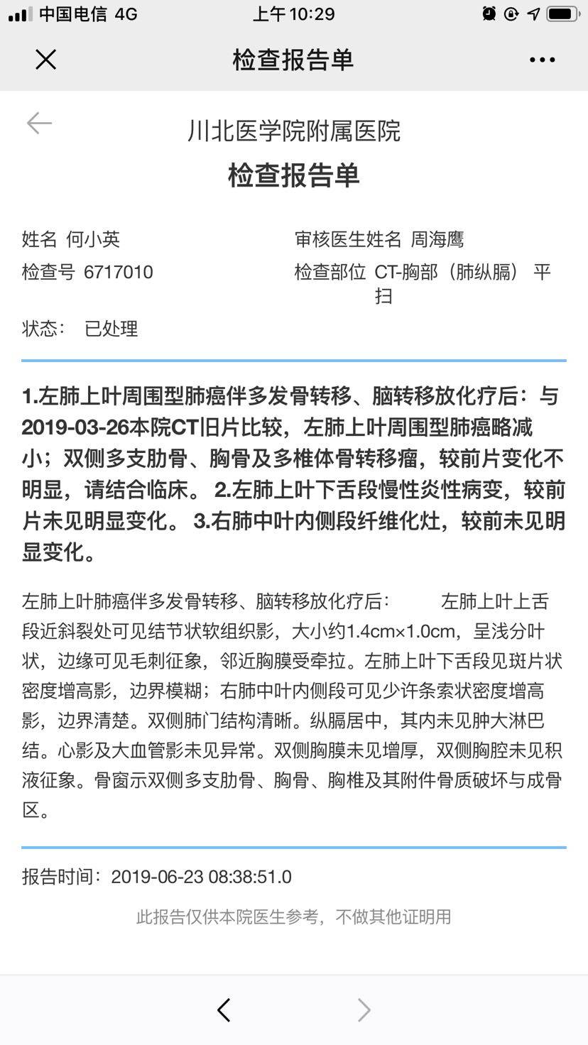 妈妈患肺癌已经有三年了,这三年来一直在接受治疗到现在,下面是妈妈检查以及治疗的过程。2010年10月,妈妈体检出肺癌IV期,纵隔淋巴转移,肝部转移,去省肿瘤医院复查,做了PET-CT,结果一样,省肿瘤
