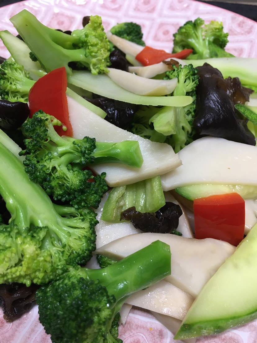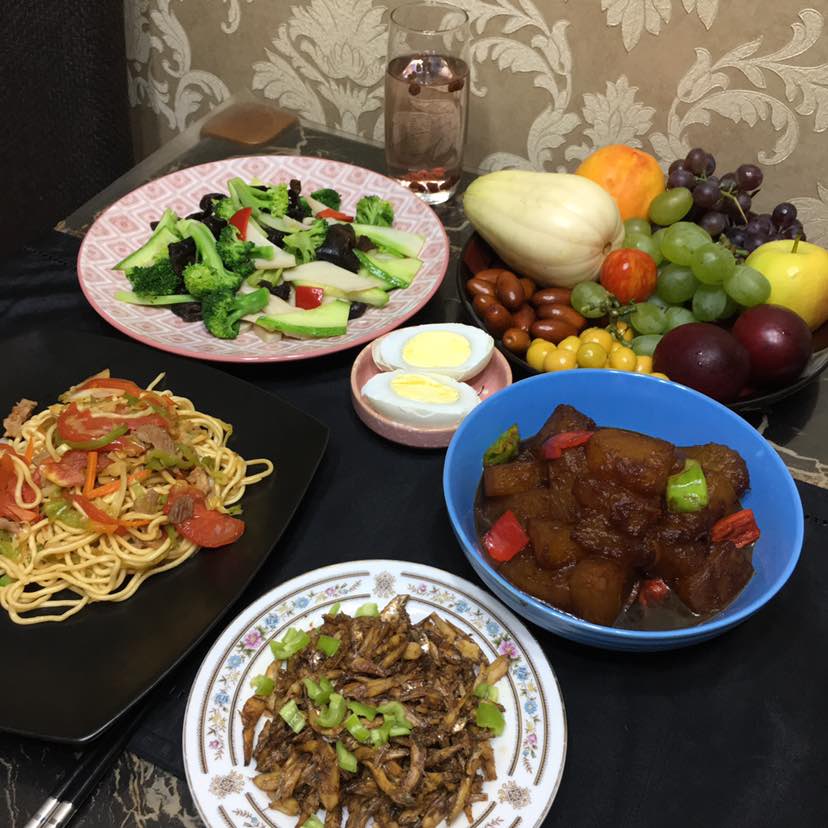 早餐:鸡腿菇木耳西兰花黄瓜炒甜椒/焖多春鱼/红烧冬瓜/鹅蛋/西红柿青椒炒肉丝面