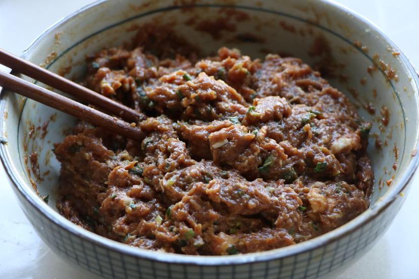 3、肉馅儿里加入生抽、老抽、盐、胡椒粉、蚝油、生姜、小葱、鸡蛋顺时针朝一个方向搅拌至上劲;