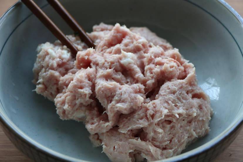 2、猪肉洗净去皮后切成小块,然后剁碎或是放入料理机搅碎;