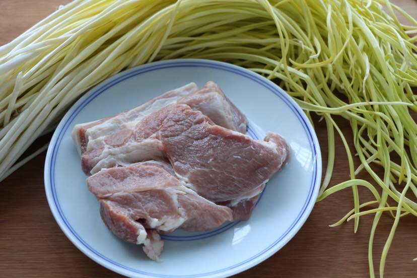 1、准备一把蒜黄和一块猪肉;